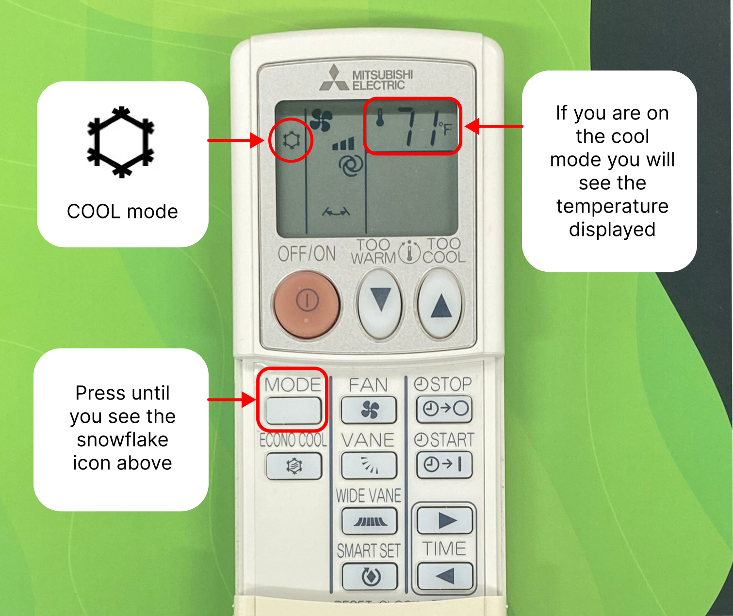 To change the mode of your AC, press the mode button until you are on the snowflake icon and can see the temperature adjustor on the right.