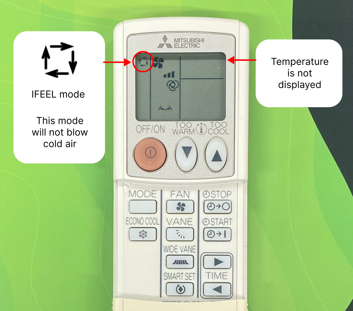 Your AC is possibly on the IFEEL mode. You can tell you're on the IFEEL mode, because the temperature isn't present on the screen